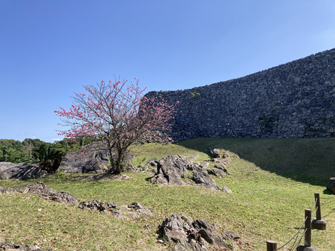 春には寒緋桜が咲き誇り、城壁と桜