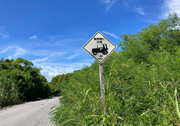 道路脇にトラクターのマークが描かれた道路標識が見えてきます。